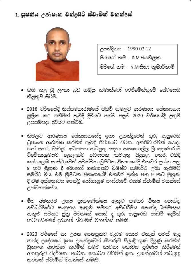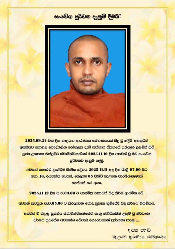 We regret to inform you that Venerable Unapana Chandusiri Thero, who was receiving treatment in the intensive care unit of a private hospital in Colombo after a sudden accident that occurred at the Na Uyana Aranya Senasana on 24.09.2025, passed away on 10.11.2025.