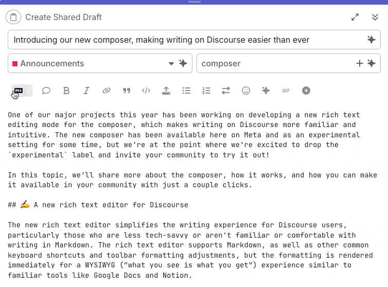The link is here: For most things, the default rich text editor interface is good. Good job discourse team.
